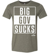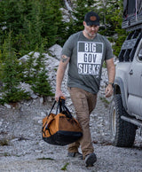 Soft and lightweight feel, plus the right amount of stretch. It's comfortable and flattering for both men and women. Distressed "BIG GOV SUCKS" screen printing on the front with the small Tactilian mountain range on the bottom right.